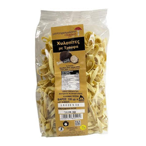 About the product: They are a traditional Greek pasta made with flour, eggs, milk, and salt. Typically shaped into long, thin strips, they may also appear as small squares depending on the region — often under different local names. Hilopites with Black Truffle! Ready in just 3–4 minutes, perfect with a red sauce, vegetables, or even meat! Homemade pasta made with fresh eggs, fresh milk, and 100% flour and grains from Grevena! From tradition to more unique and bold flavors.